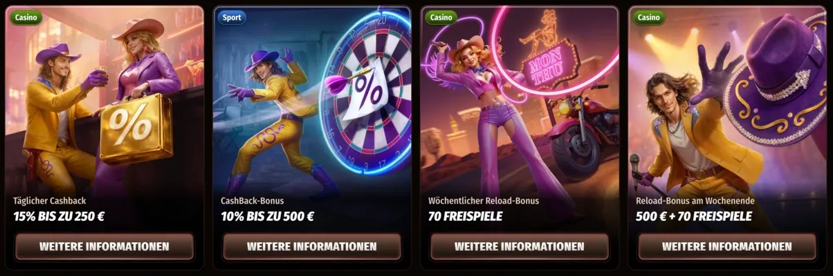 - Weekend Reload (Fr-So): Ein satter Bonus von 50% bis zu 500 € plus zusätzlich 70 Freispiele.
