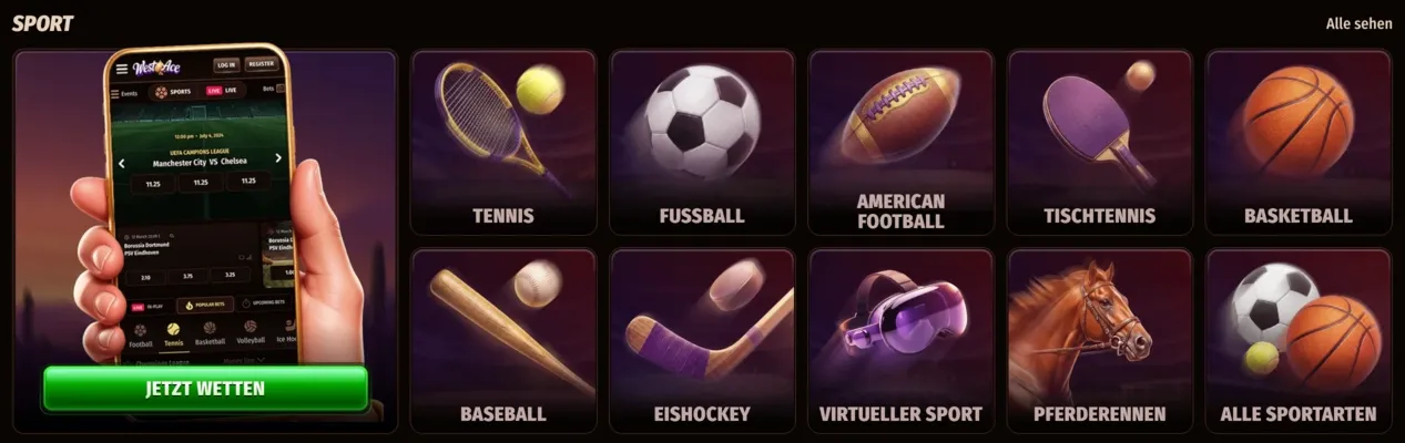 Auch die Sportfans kommen bei West ace voll auf ihre Kosten. Die Plattform versteht, dass Sportwetten eine eigene Dynamik haben, und bietet daher spezialisierte Pakete an, die den Einstieg in die Welt der Live-Wetten und Prematch-Märkte massiv erleichtern.